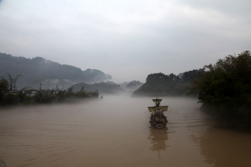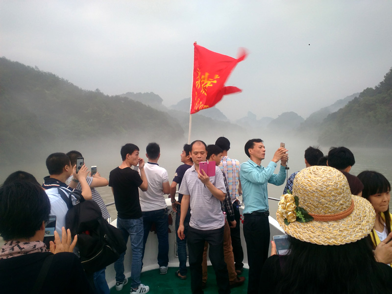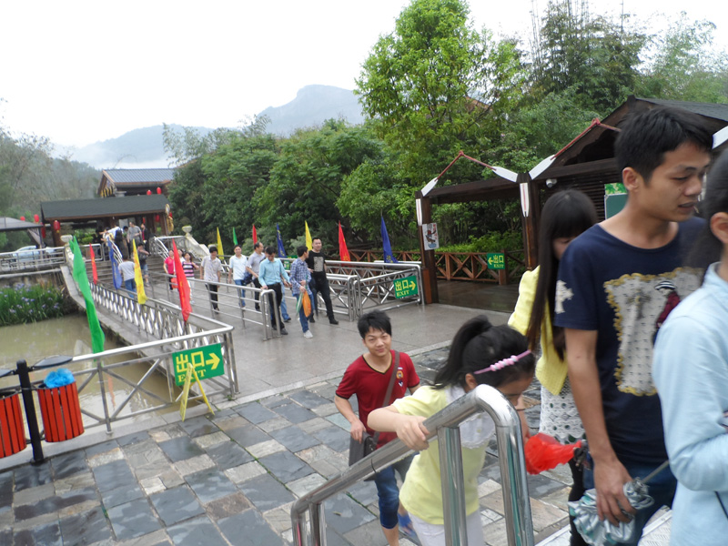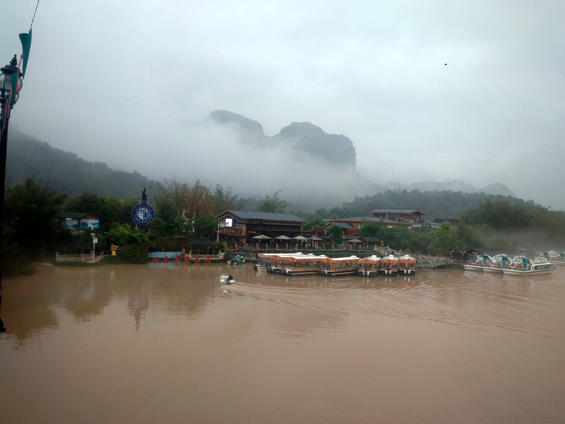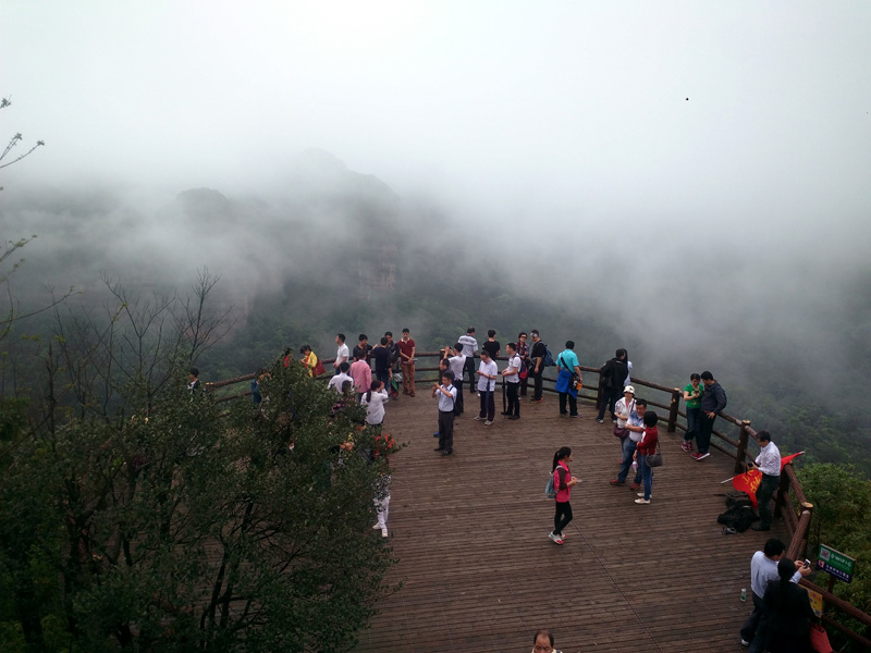 剛到丹霞山附近,就下起了瓢潑大雨,好像是老天有意要讓我們這些遠道而來的游客先歇歇腳。沒辦法,只好在用過午餐后到預先訂好的旅館內休息。約莫過了1小時,雨終于停住了,團隊終于可以出發了。我們步行來到景區門口,照張集體照顯然是很有必要的。在導游的帶領下,團隊一行漫步來到了第二站:丹霞山的標志性景區陽元山。一路游客并不多,主要聚集在拍攝區拍攝陽元石,然后原路返回。第三站:水上丹霞乘坐游船游錦江。人們常說“桂林山水甲天下,陽朔山水甲桂林”,我認為錦江山水完全可以與漓江相媲美。我們登上游船,在船長的講解下,充分發揮大家的想象力,一路可以看到睡美人、群象出山,六指琴魔、拇指山、龜頭山、啤酒瓶山等自然景觀,每一景點無不形神相似。江兩岸的綠樹、紅巖、霧海、寺廟以及河流構成了如夢如幻的人間仙境,真有種“舟行碧波上,人在畫中游”的感覺,充滿了詩情畫意。